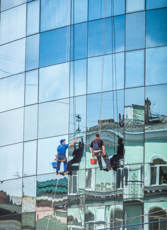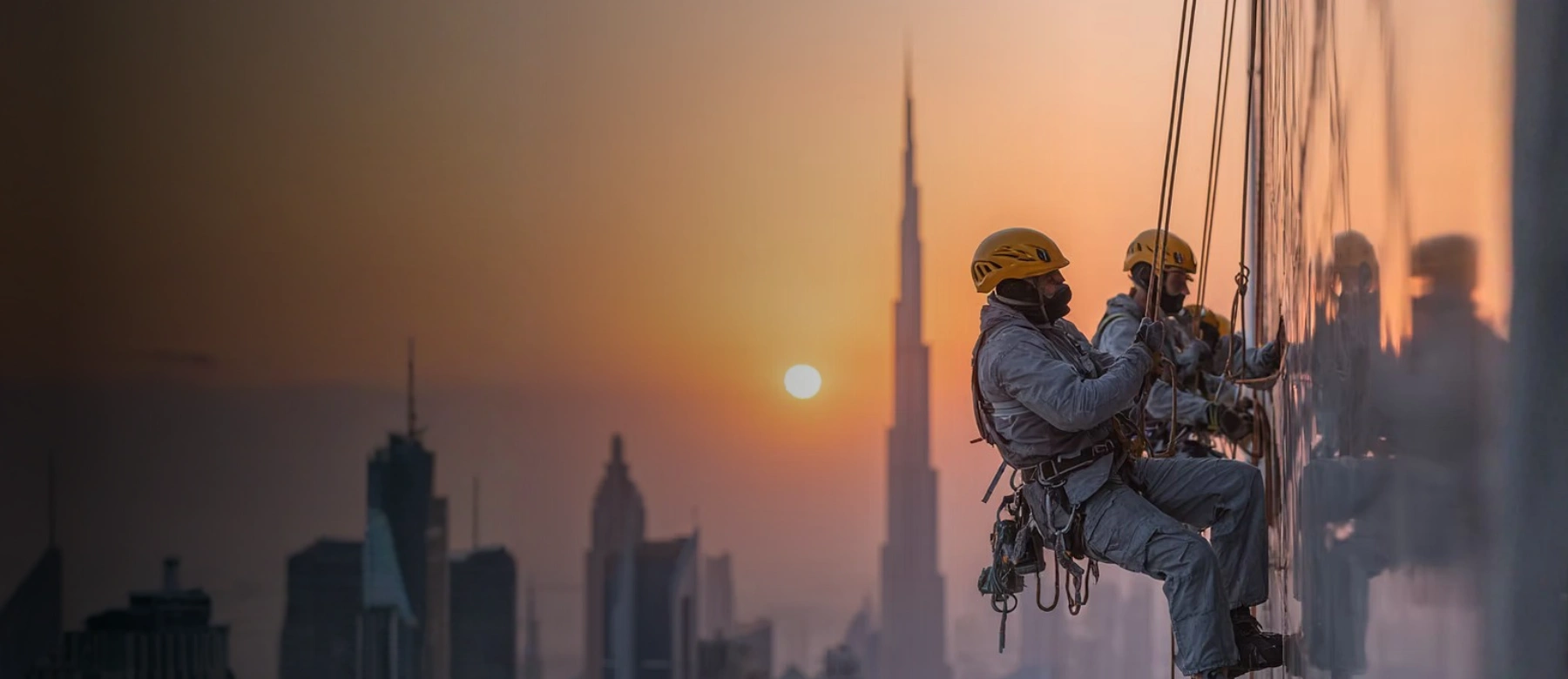 Specialized rope-access technicians delivering safe, controlled exterior cleaning for towers and high-rise buildings across Dubai, Sharjah, and the UAE.